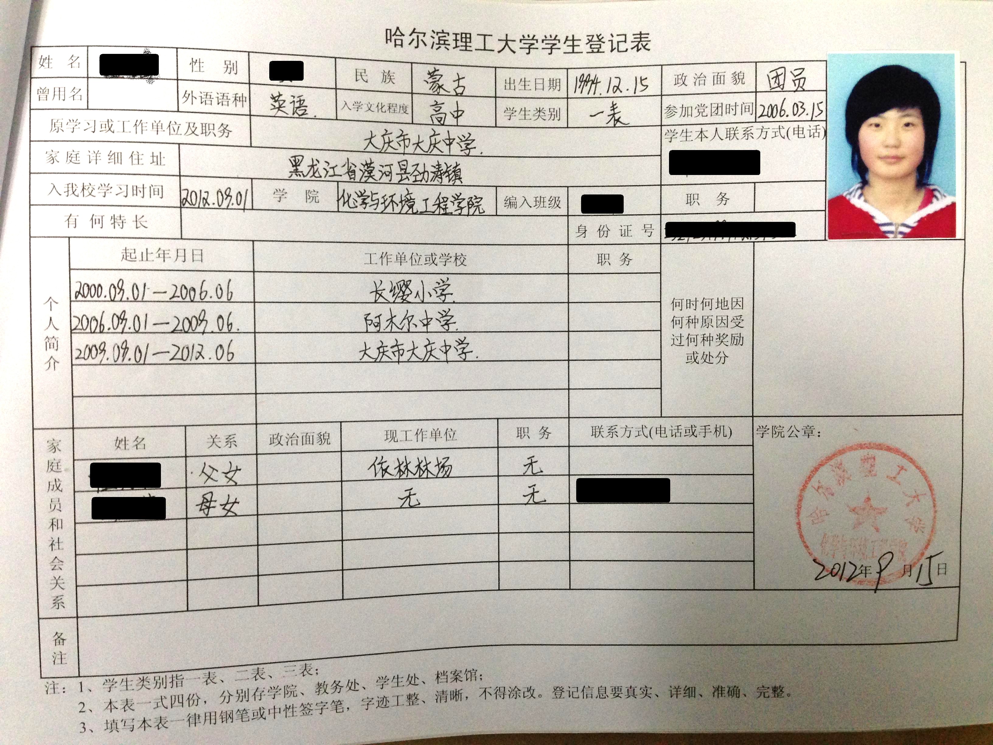 2025级全体新生入学时填写的《哈尔滨理工大学学生登记表》学籍材料。