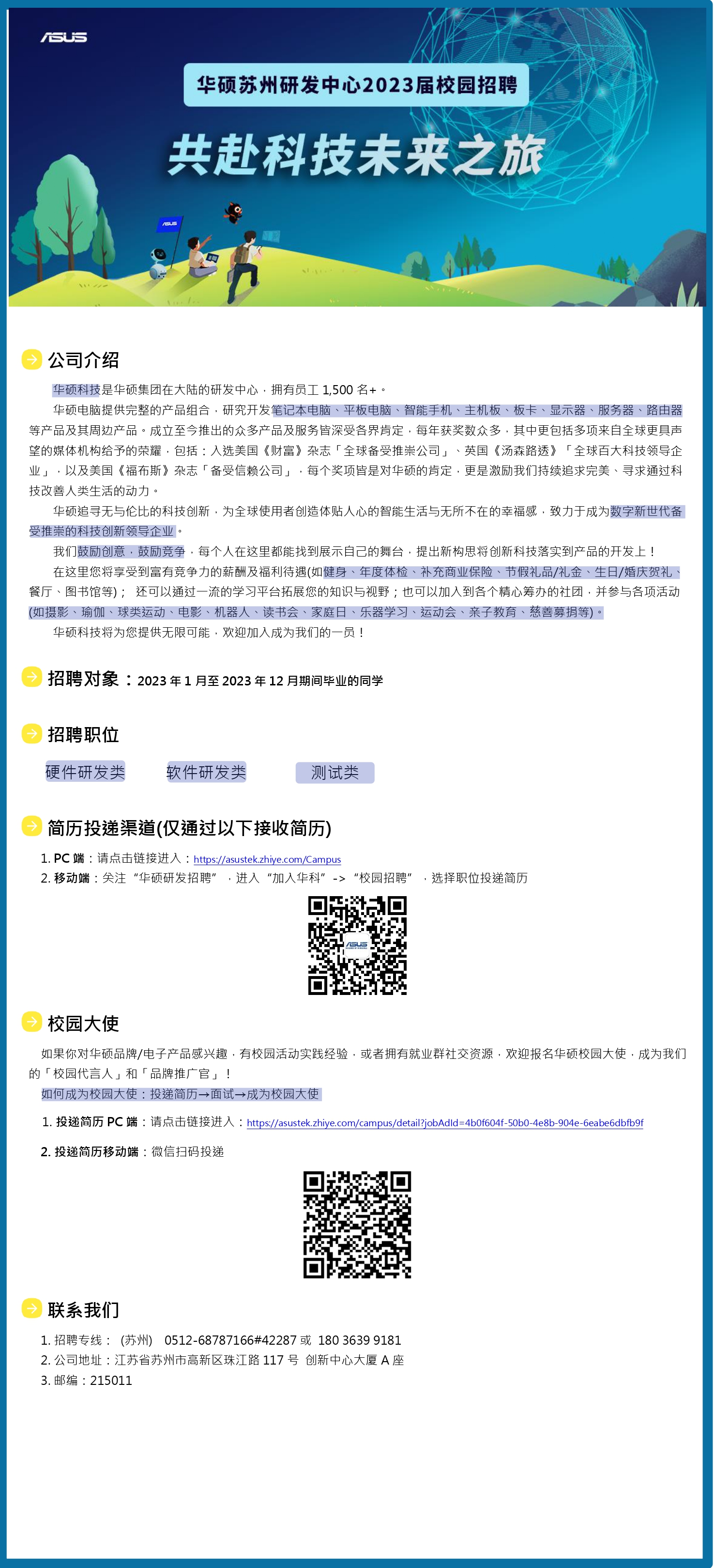 华硕苏州研发中心2023届春季校园招聘正式开启!