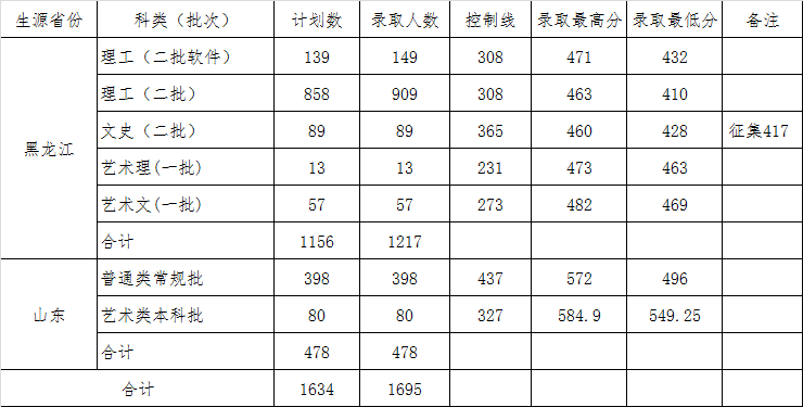 黑龙江省招生计划分为本科二批(A)和艺术类本科一批(A)两个批次。本科二批(A)中,理工类共录取1058人,其中,代码2626下录取909人,分布在19个专业,录取最高分463、最低分410;代码2627下录取149人,为软件工程专业,录取最高分471、最低分432;文史类共录取89人,录取最高分460、最低分428(征集志愿417);艺术类批次共录取70人,其中艺术理录取13人,录取最高分473、最低分463;艺术文录取57人,录取最高分482、最低分469。